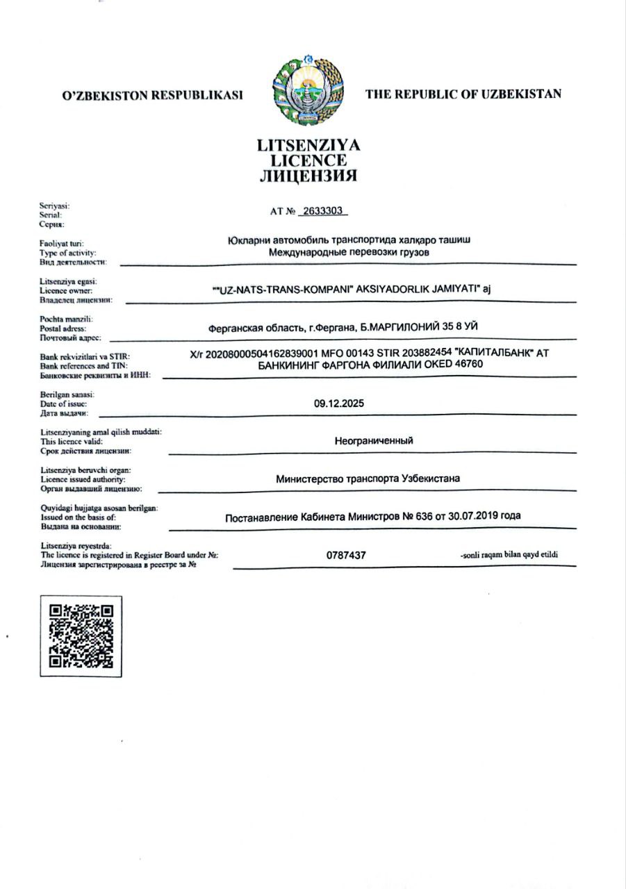Здравствуете, уважаемые коллеги, закрытое акционерное общество «Uz-Nats-Trans-Kompani», расположено в жемчужине Республики Узбекистан – Ферганской долине, через которую проходил великий Шёлковый путь. В течение 25 лет наша организация является одной из лидеров отрасли логистики и занимается грузоперевозками по международным перевозкам. В нашей деятельности мы используем водный, автомобильный, железнодорожный, воздушный транспорт по всем направлениям. У наших сотрудников есть большой опыт по оформлению международных документов по перевозкам любого вида груза, которые не запрещены международным законодательством и законодательством Республики Узбекистан.
